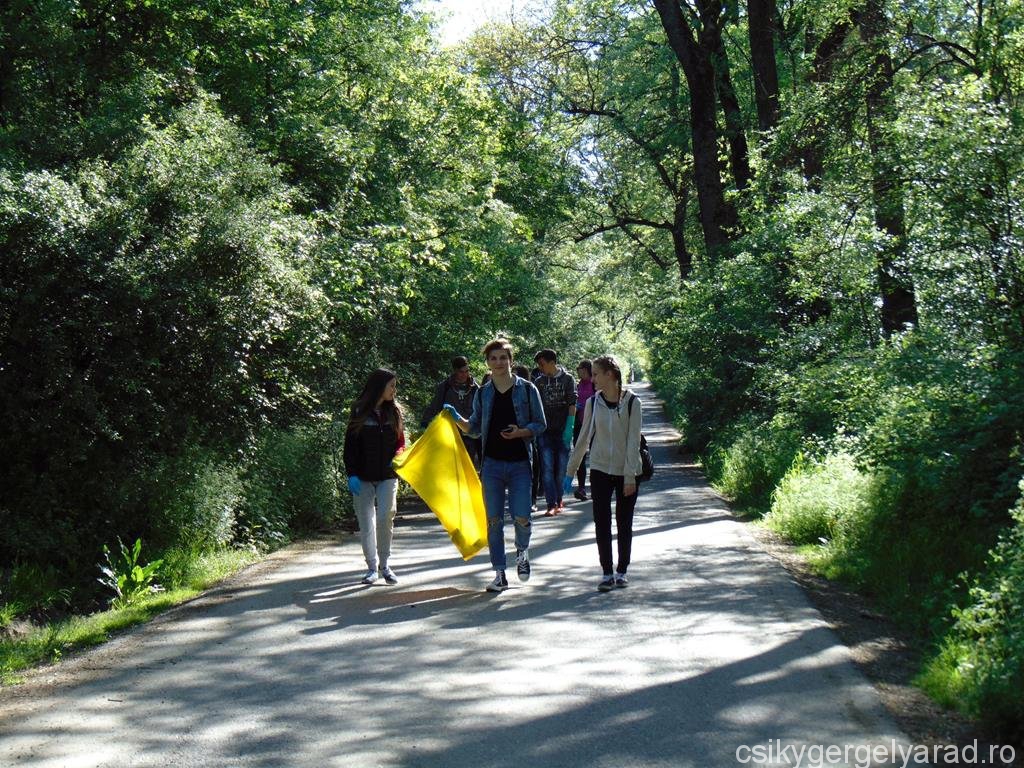 A Maros-ártér Tájvédelmi Központ munkatársaitól kapott gumikesztyűkkel és műanyag zsákokkal felfegyverkezve láttunk munkához. Volt, aki egyedül és volt, aki két-három fős csapatban dolgozott. A legvégén összehasonlítottuk, hogy kinek mennyi szemetet sikerült begyűjtenie, és aki a legszorgalmasabb volt, ajándékban részesült.