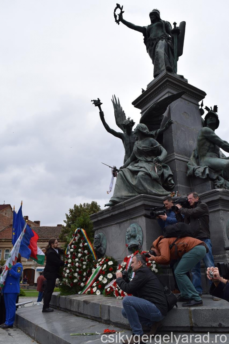 A Szabadság-szobor előtt a megszokott módon, a román és a magyar himnusz, illetve Beethoven Örömódájának lejátszásával kezdődött a megemlékezés. Gheorghe Falcă aradi polgármester lépett először a mikrofonhoz, majd Kelemen Hunor, az RMDSZ országos elnöke szólt a jelenlévőkhöz. „Minden szabadságharc az emberi méltóságért folytatott harc is egyben. Így volt ez 1848-ban, igaz ez az 1956-os forradalomra, és nemkülönben 1989-re. Szabadság nélkül nincs emberi méltóság, és emberi méltóság nélkül nincs szabad, Isten teremtményéhez méltó élet.”