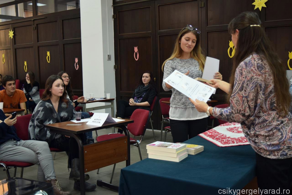 A vetélkedő összesen 9 feladatból állt: betűpiramis, névjegy-fejtörő, palindrom-szórejtvények, betűrejtvények, „Nanana!”, rejtőzködő közmondások keresése (a diákok visszajelzése alapján ez volt a legnehezebb), dadogós feladat, anagrammás feladat. A feladatok megoldására szánt idő 5 és 7 perc között váltakozott (nehézségi foktól függően). A zsűri gyors és precíz munkájának köszönhetően az egyes fordulók eredményei hamar megszülettek, és a csapatok a kivetítőn nyomon követhették pontszámaik alakulását. Eredményhirdetés előtt Naschauer Kinga, IX. A osztályos tanuló tolmácsolásában elhangzott Vészi Endre Hazám az anyanyelvem című költeménye, majd az utolsó feladat pontszámait is közölte a zsűri. A 3. helyen két csapat között holtverseny alakult ki, így ők egy újabb (rövid) feladatot kaptak. Ennek megoldása után a következő végeredmény született meg: I. helyen végeztek a Kuncogók, azaz Mészáros Letícia Izabella, Naschauer Kinga Beatrix és Spir Rebeka Petra (IX. A osztályos tanulók); II. helyezettek lettek a DorEm(V)i csapat tagjai, azaz Czernák Dorottya, Lovas Éva és Zsámbok Emese (XI. A osztályos tanulók); III. helyen végeztek a Zseniálisak, azaz Kurunczi Viktória, Mureşanu Anna, Simpf Angelika (X. A osztályos tanulók); dicséretben részesültek a Disznők, azaz Bold Barbara, Rudolf Anna és Bacsilla Sándor (XII. A osztályos tanulók). A Szabadság-szobor Egyesület, valamint a Pro Schola Csiky Gergely Egyesület támogatásának köszönhetően a nyertesek értékes könyvjutalomban részesültek, ugyanakkor minden résztvevő egy szép kivitelezésű könyvjelzőt kapott emlékbe, a kétórás intenzív szellemi munka után pedig finom süteményekkel pótolhatták energiájukat.