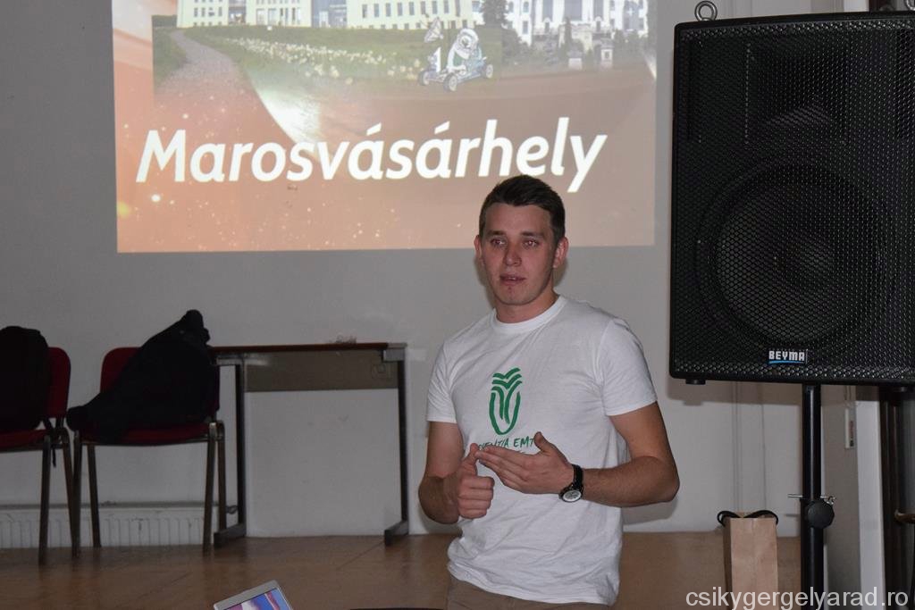 A diákok egyenként ismertették a csíkszeredai, marosvásárhelyi, majd a kolozsvári kart egy-egy érdekes videóval. Ezután felsorolták, hogy az adott karon milyen szakokra felvételizhetünk (reál és humán szakokat egyaránt), felsorolták az egyetem által szervezett versenyeket és a lehetséges ösztöndíjakat. Az előadást záró kisfilmben a pezsgő, aktív egyetemi életet hangsúlyozták ki, betekintést nyújtva néhány, az egyetem diákönkormányzata által szervezett programba.