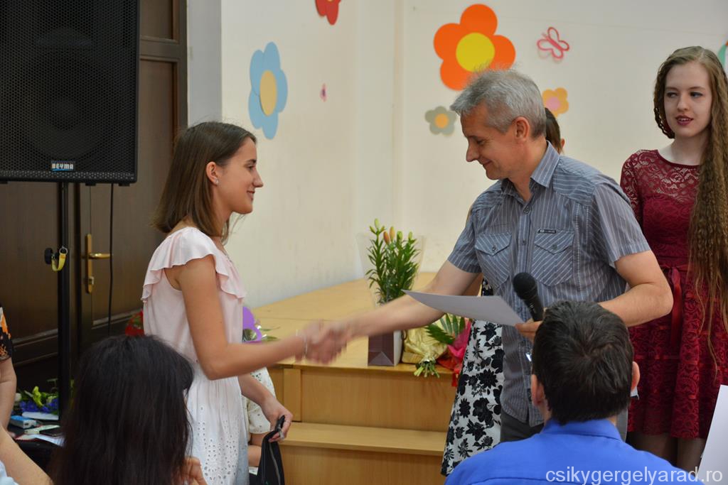 Az ötödikes Dobos Carlos, illetve a hatodikos Rónai Zoltán szavalatával indult az V–VII. osztályosok évzárója a díszteremben, majd az igazgató bácsi, Dr. Muntean Tibor „egészen hosszú” beszéde következett: „Végre, vége! Kellemes vakációt kívánok mindenkinek!” Naná, hogy jó hangulat teremtődött seperc alatt! Tóthpál Renáta aligazgató és Lészay Ildikó, az iskola szülői bizottságának elnöke jelenlétében került sor ezután a sokféle tantárgyversenyen, vetélkedőn eredményesen résztvevők jutalmazására. Következett a legjobb tanulmányi eredményt elérők díjazása. Fekete Karolina angoltanár az V., Back Mária katolikus vallástanár a VI., Spier Tünde matematikatanár pedig a VII. osztály legeredményesebb tanulóit hívta ki az oklevelek és a jutalomkönyvek átvételéhez. Végül az iskolai kórus általános iskolás tagjai Szabó Csilla zenetanár irányításával adták elő az Örökségünk című dalt.