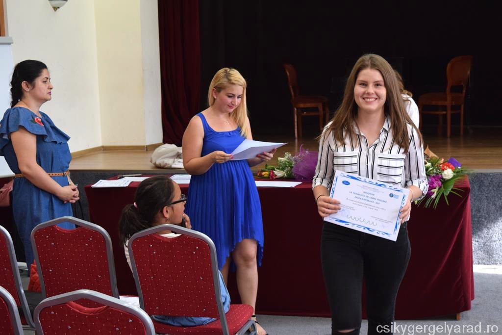Június 14-én, szerdán délben eredetileg a Városháza Ferdinánd-termében került volna sor többféle tantárgyverseny országos díjazottjainak gálájára. A Ferdinánd-terem azonban foglalt volt abban az időpontban, így a több száz diákot, pedagógust és érdeklődő szülőt a Moise Nicoară Főgimnáziumba irányították át. A gálán két csikys diák is jelen lehetett: Kurunczi Viktória (X. A), Rudolf Ágnes tanítványa, illetve Sallai Eszter (VII. o.), Nyári Andrea tanítványa. Mindketten a Mikes Kelemen Magyar Nyelv és Irodalom Tantárgyverseny országos szakaszán kaptak dicséretet. Az oklevélhez ott egy szerény – rendkívül szerény – pénzjutalom is járt. (A helyszínváltoztatás miatt, sajnos, Sallai Krisztináról és Nyári Andreáról egyáltalán nem készült fotó, Kurunczi Viktóriáról és Rudolf Ágnesről pedig csak átvett fotónk van – szerk. megj.) [Fotó: Kurunczi Ferenc, arq.ro]