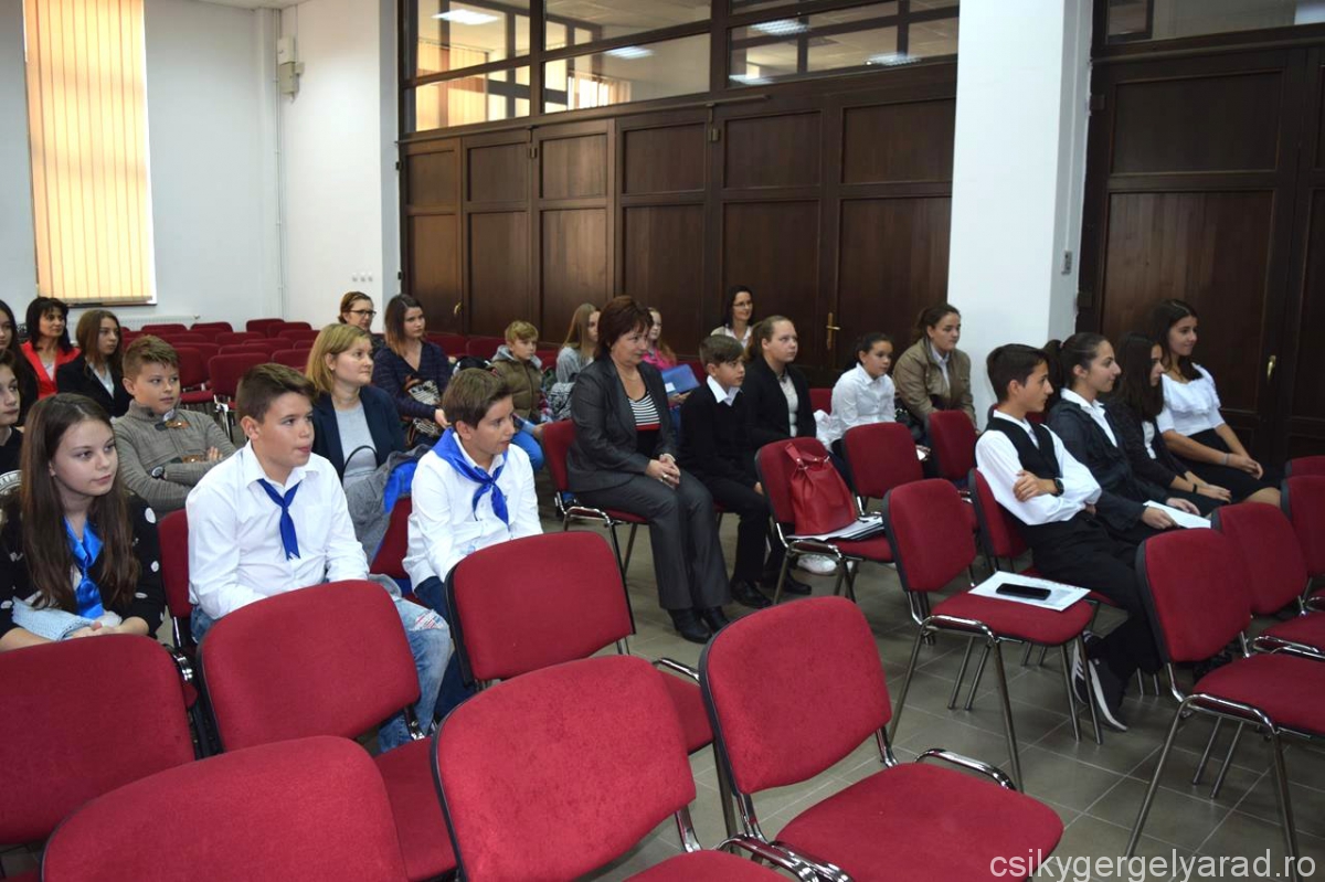 Dr. Muntean Tibor iskolaigazgató és Hadnagy Éva, az alapítvány ügyvezető elnöke üdvözölte az Ágyai Olosz Lajos Általános Iskola, az Aradi Aurel Vlaicu Általános Iskola, az Erdőhegyi Általános Iskola, a Kisiratosi Páter Godó Mihály Általános Iskola, a Simonyifalvi Simonyi Imre Általános Iskola, a Zerindi Tabajdi Károly Általános Iskola, a Zimándújfalui Móra Ferenc Általános Iskola, illetve a Csiky Gergely Főgimnázium (V–VIII. osztályos évfolyamainak) négytagú küldöttségét, illetve a kísérő tanárokat.