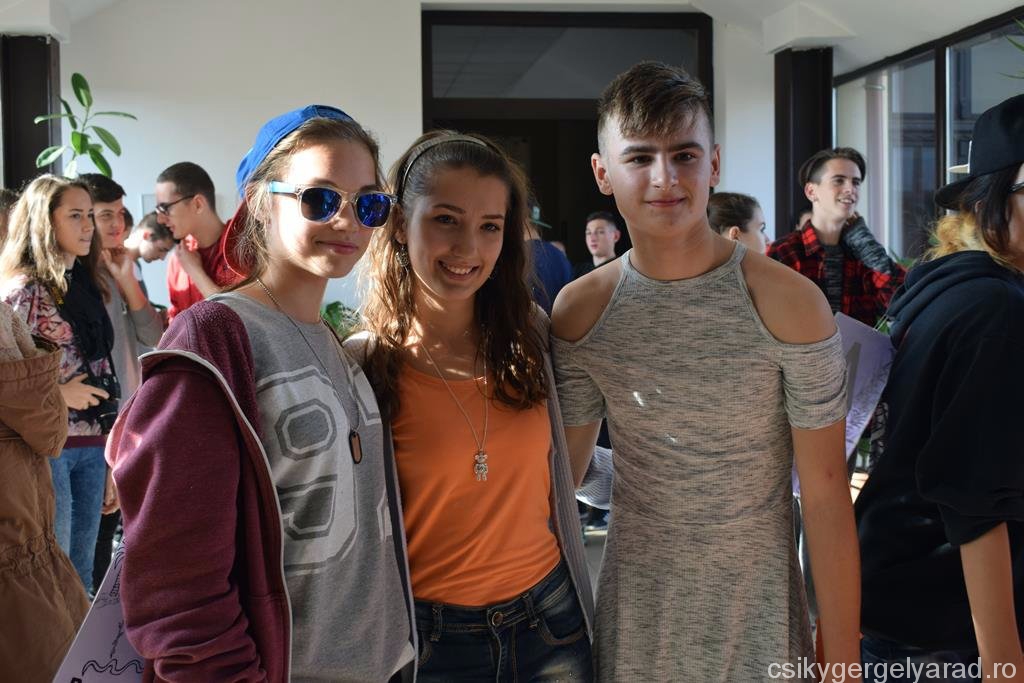 S hogy mi volt a mai feladat? Nos az, hogy a gólyalányok fiúnak, a gólyafiúk pedig lánynak öltöztek be a párjuktól kapott ruhák segítségével. (A legtöbben ezért öltözőnek, illetve sminkszalonnak is használták ma az osztálytermet.) A gólyák egész nap jelmezben kellett hogy maradjanak, így a diákok és a tanárok egyaránt jó alaposan megcsodálhatták őket. És jókat is kacarásztak rajtuk, főleg a „gólyalányokon”…