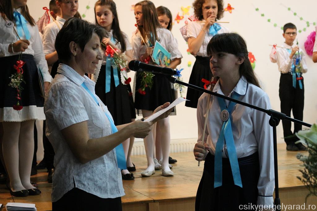 A Böszörményi-díjat a magyar nyelv ápolásáért idén Budacsek Tímea (IV. B) vehette át. Amint arról korábban beszámoltunk, a csikys Párducok lettek a 20. Kurutty általános műveltségi verseny országos győztesei, ezért a csapat tagjai – Tamás Lőrinc (I. o.), Kiss Cintia (II. o.), Veres Zsombor (III. o.) és Budacsek Tímea (IV. B) – Alma Mater-díjban részesültek. Az elemi osztályos tanulók egész évi munkájának kiértékelése következett, osztályonként: Kurunczi Enikő tanító az előkészítősök, Leib Gáspár György az elsősök, Khell Levente a másodikosok, Khell Jolán pedig a harmadikosok tanulmányi és versenyeredményeit vázolta. Bálint Erika (IV. A) és Almási Valéria (IV. B) könyvekkel jutalmazta a ballagó negyedikeseket.