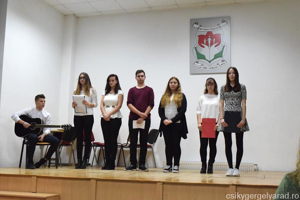 A műsor igen sokszínű volt, a jelenlévők szavalatokat, levélrészleteket, valamint gitárkísérettel előadott megzenésített verset hallgathattak meg a fellépő diákok előadásában. Több osztályból voltak fellépők: Gyarmati Timea, Lészay Sarolta (V. B), Iambric Izabella (IX. C), Almási Dóra, Tóthpál Eszter (X. A), Naschauer Kinga, Mártonfi Gedeon (XI. A), Köteles Nikolette (XII. A), illetve Godó Ákos (XII. C). Őket a Communitas Alapítvány jóvoltából megajándékozták egy kis ajándékkal is.