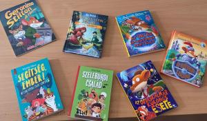 28 könyvadomány is érkezett, Nagy Nikoltól (V. B) 9 darab, Nyári Melinda tanárnő felajánlásából egy Rumini, de kaptunk Gyuláról és egyéb helyekről is.