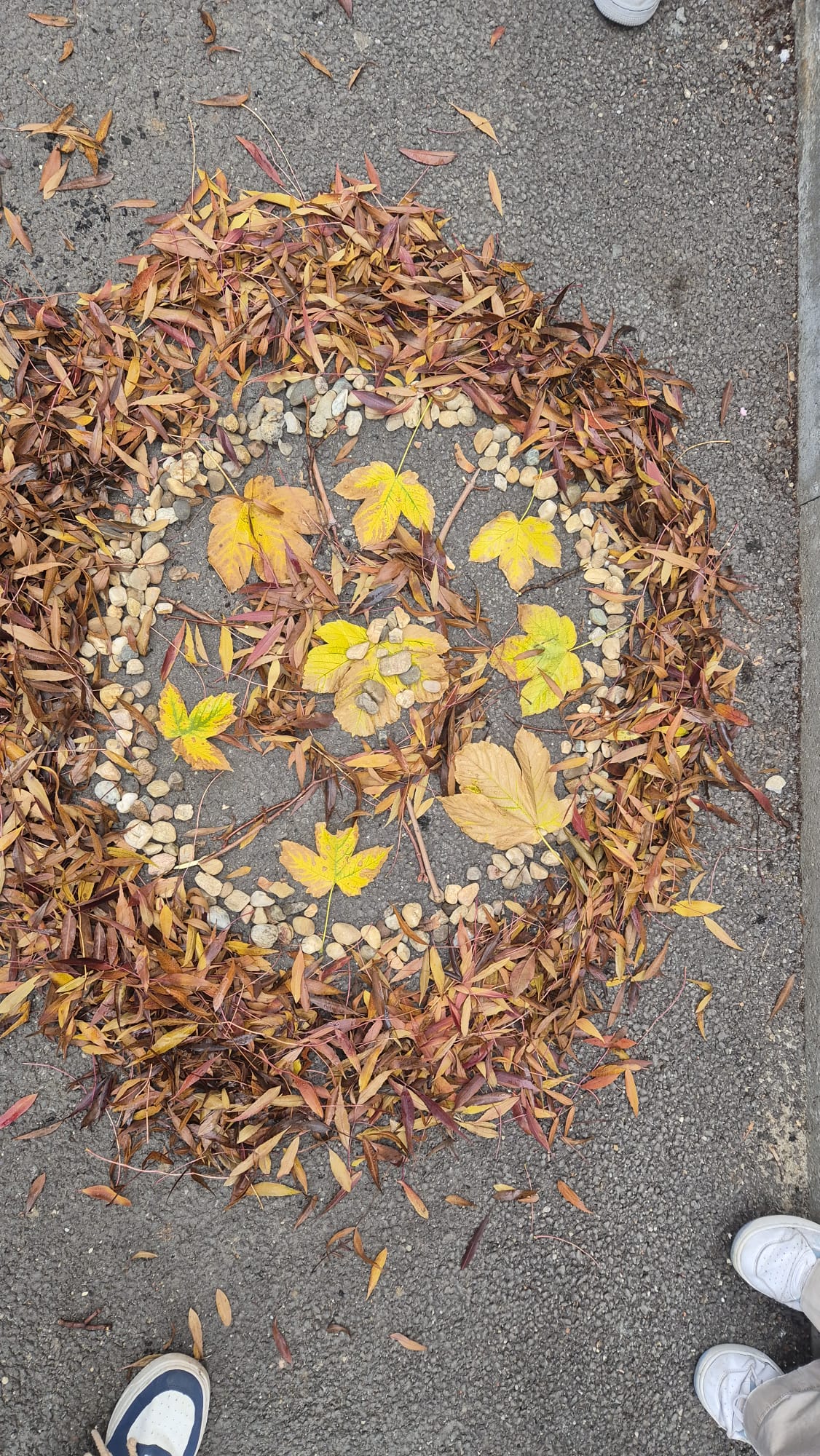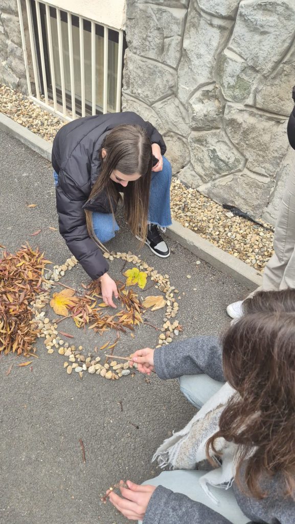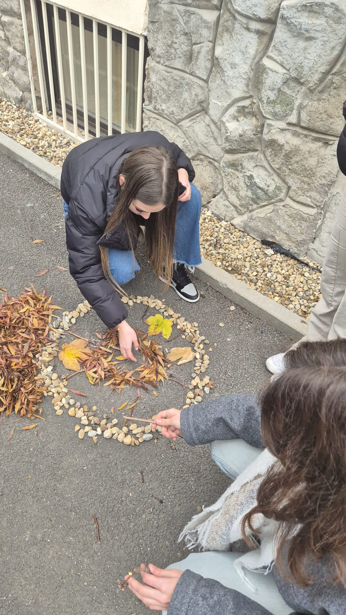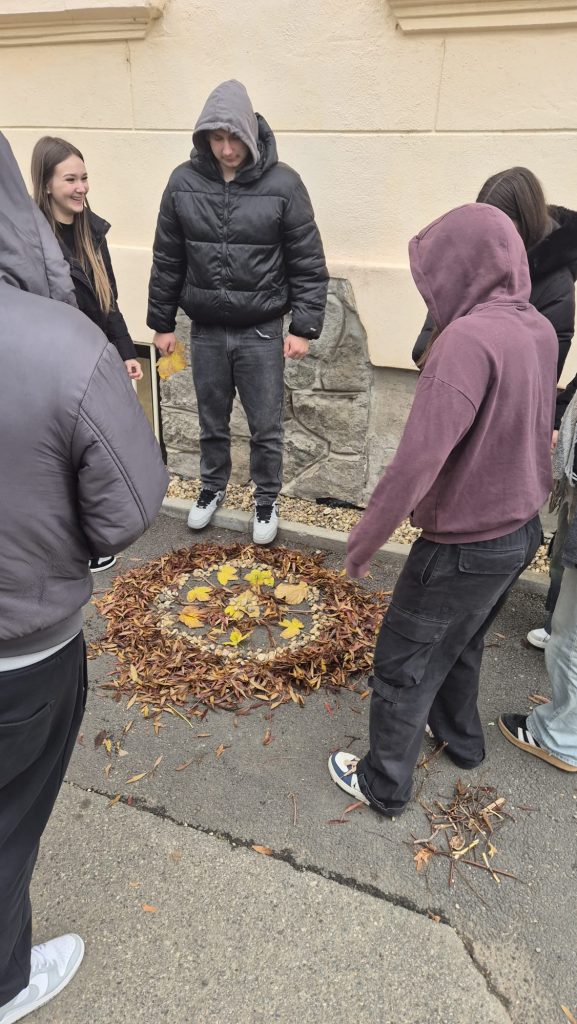 A diákoknak két feladatot kellett elvégezniük. Mivel az ősz szépsége volt a téma, a tanulók portrékat készítettek természetes elemekből, például levelekből, kövekből, ágakból, természetesen anélkül, hogy kárt tegyenek a természetben. A portrék mellett az osztály közösen készített egy mandalát is, amely a kint töltött idő után érzett belső nyugalmat tükrözte.
