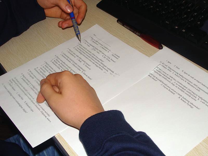 Ma 11–12 óra között került sor az internetes forradalmi totóra. Izgalmas volt már az is, hogy a számítástechnika teremben dolgoztunk Ilona János tanár úr felügyelete alatt. Az Arany János tanárai által összeállított 13 + 1 kérdésre kellett megkeresnünk a helyes választ úgy, hogy az internetet is használhattuk és hárman együtt dolgozhattunk. A csapat tagjai: Cara Alessio, Tóthpál Béla és Péró Kitti. De hogy biztosan meglegyünk időben, azt a taktikát választottuk, hogy fél óráig külön-külön keresgéltünk, majd összevetettük, és véglegesítettük a megoldásokat.